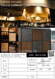 会場となる鹿田室礼ショールームは、世界的建築家・隈研吾氏デザインによる空間です。創業110周年を機に改装されたショールームで、ココモザイクタイルの造作例をはじめ、竹すだれ生地、ラタン編み生地、ラタン家具「KKシリーズ」など、天然素材が織りなす空間提案をご体感いただけます。