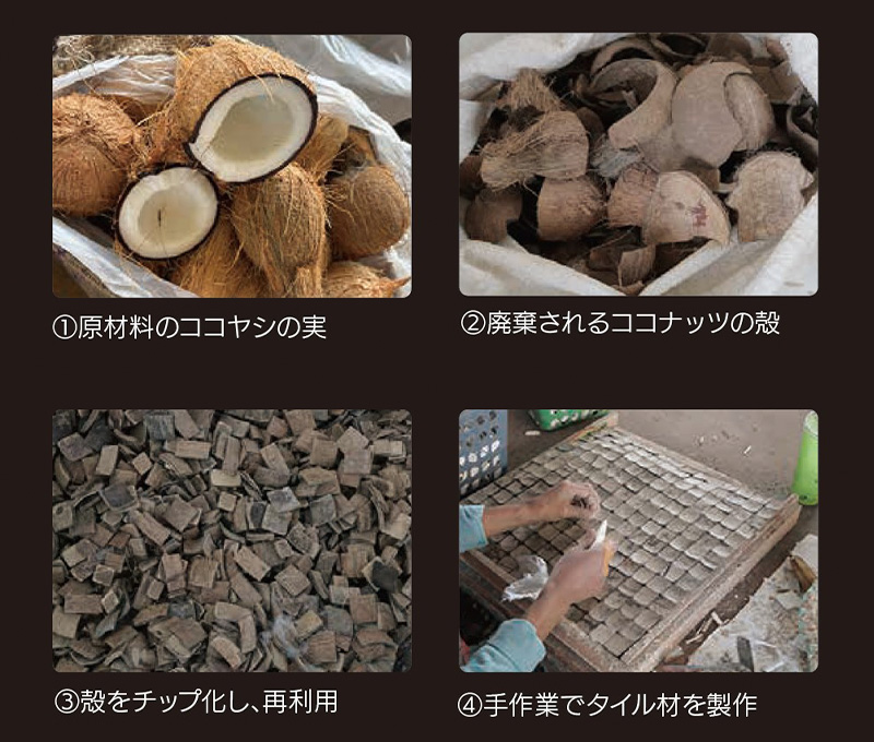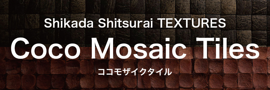 本来廃棄されるココナッツ殻をチップ化し、内装材として再利用したアップサイクル素材から生まれた、天然素材の装飾用モザイクタイルです。家具・建具・間仕切りなどの装飾用途を想定し、天然素材を商空間で“使える意匠”として成立させることを目的に開発されました。
